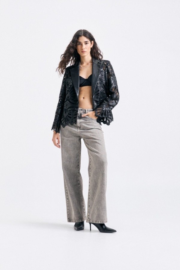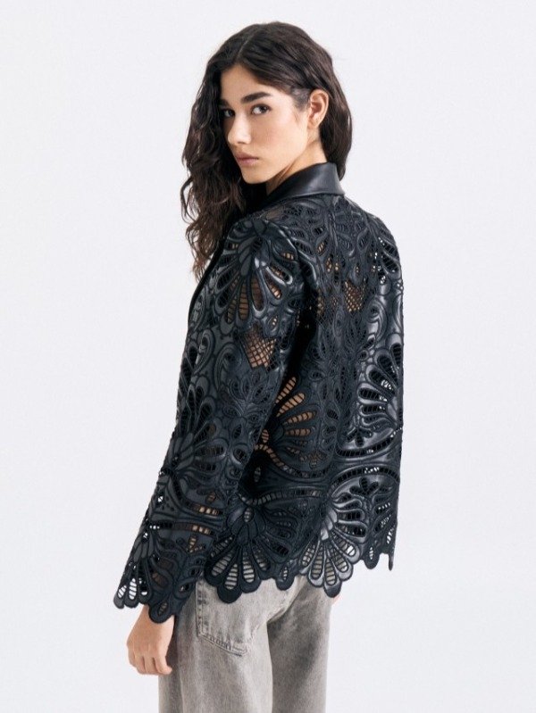 Blazer confeccionado en simil cuero calado en cuerpo y manga. Cuello y solapa confeccionado en simil cuero liso.
