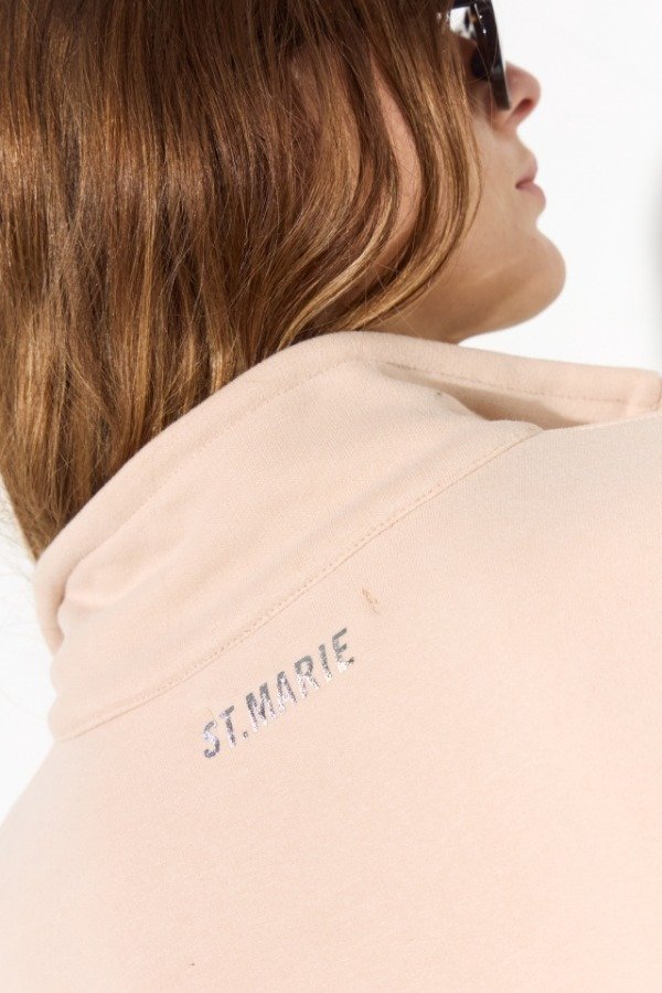 Buzo de rústico, en su delantero posee dos bolsillos invisibles y su escote cuenta con un cierre de plástico a tono con tira cierre para abrir o dejar cerrado a gusto, todo el exterior está pespunteado con hilo a tono y en el centro de su espalda, lleva un reflex con la marca grabada. También está combinando en puños y ruedo con un jersey a tono.