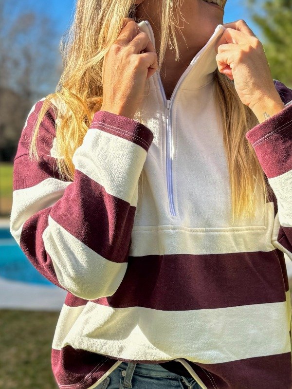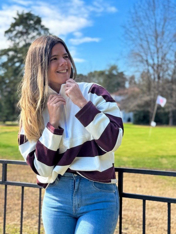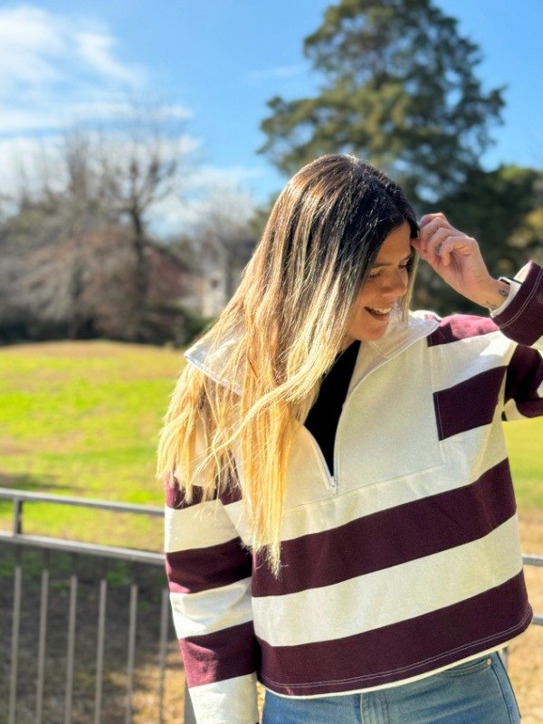 Confeccionado con tela frisa rayada y brisado por dentro con polar, es de tela suave, comodo y abrigado. Es talle único, sede hasta un talle "L". Es de rayas y con cierre en el cuello. Estilo chomba Polo muy en tendencia.