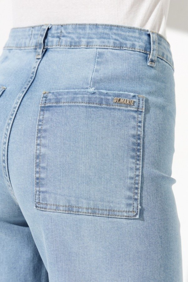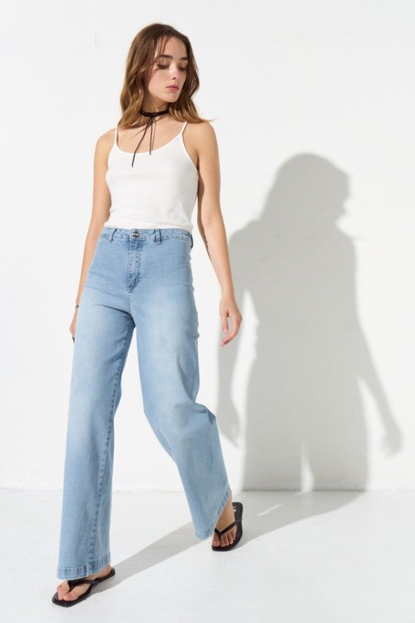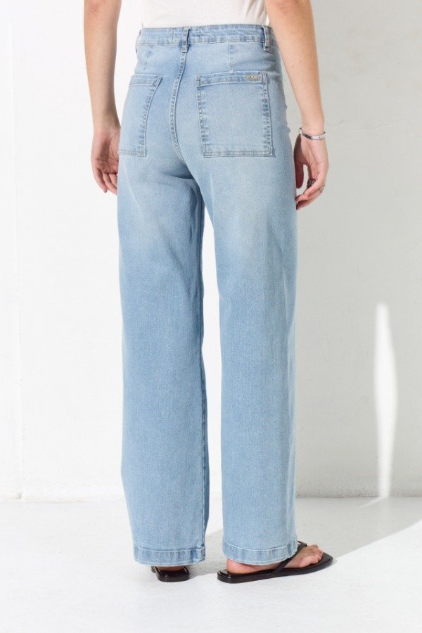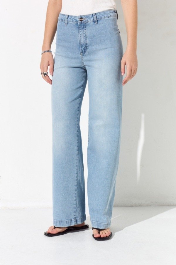 Jean wide leg elastizado, no lleva costura lateral, el mismo posee un tiro alto y su ruedo es normal con dobladillo. En el trasero lleva dos pinzas de entalle, y bolsillos plaqué superpuestos, a modo de detalle lleva la chapita con identificación de marca.