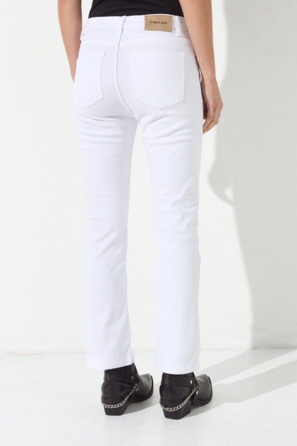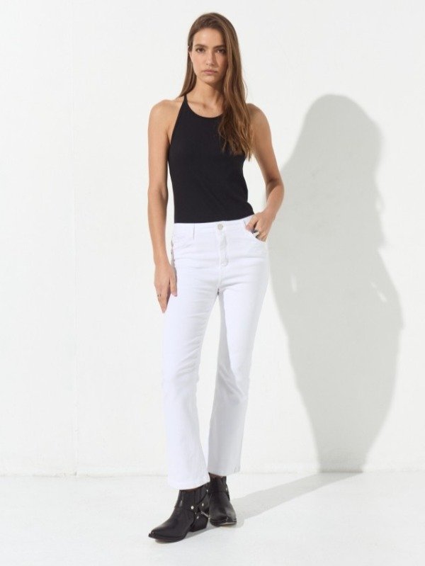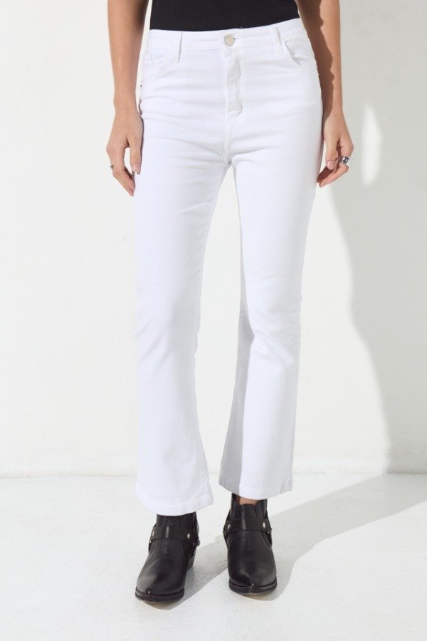 Jean calce bootcut tiro alto elastizado 5 bolsillos. Largo al tobillo. Composición: 98% algodon 2% elastano