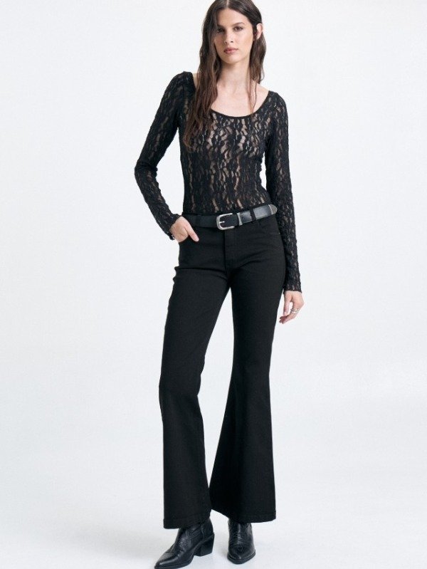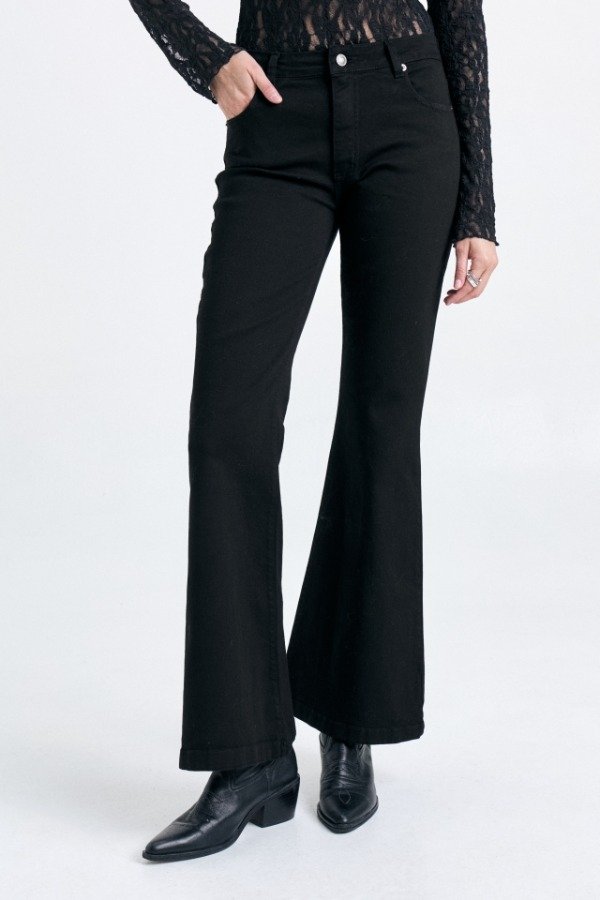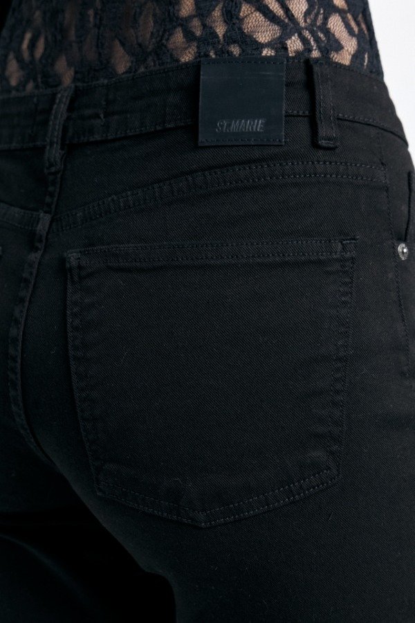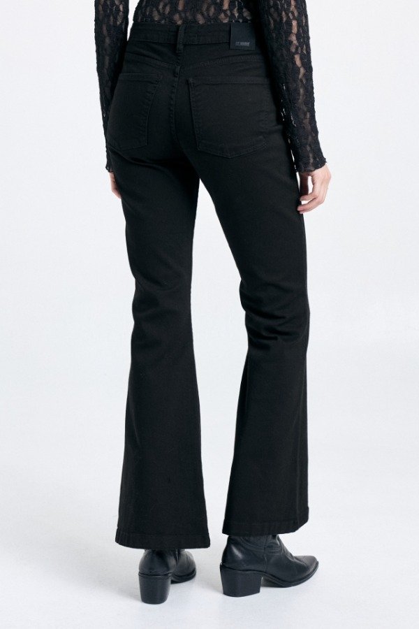 Jean oxford tiro medio, cinco bolsillos elastizado. A modo de detalle en el bolsillo trasero cuenta con una chapita de metal con identificación de marca.