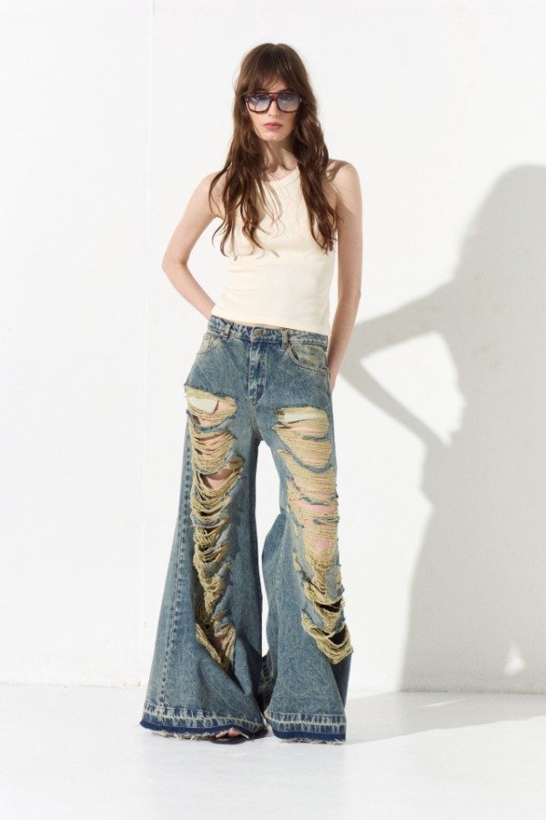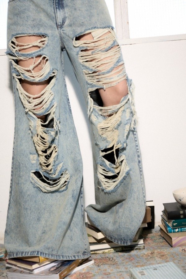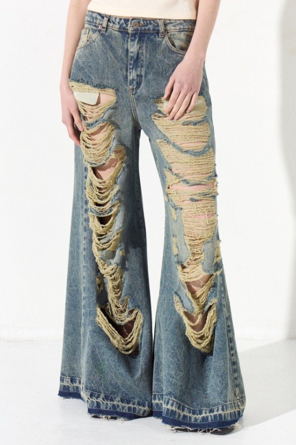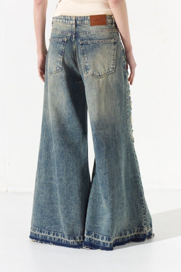 Jean super wide, de tiro medio, el pantalón posee cinco bolsillos. Las piernas delanteras presentan roturas. En la cintura espalda lleva una badana en color camel con la marca grabada.