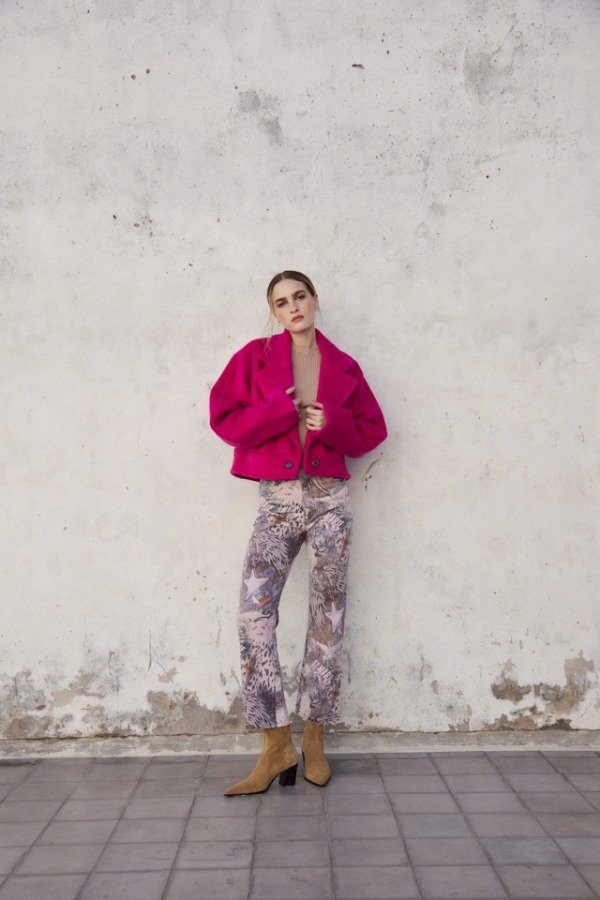 Jean print calce boot cut. Largo al tobillo. Cinco bolsillos.