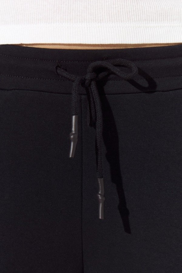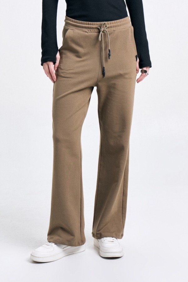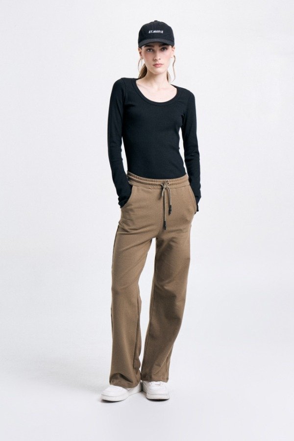 Pantalón de rústico con lycra, de calce recto, con cintura elastizada y tiras de cordón plano con punteras. Lleva bolsillos internos en la delantera; en la boca del bolsillo izquierdo lleva plastisol marcario.
