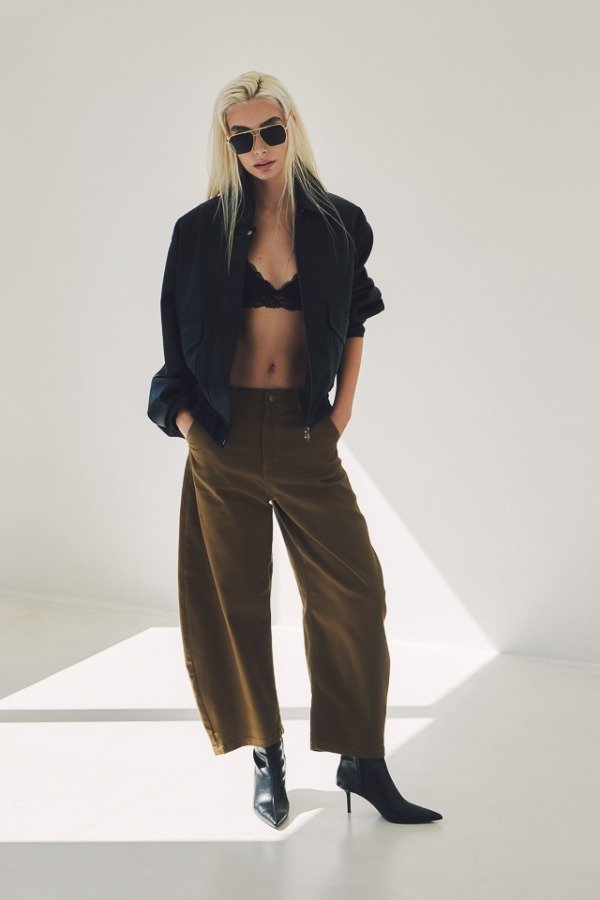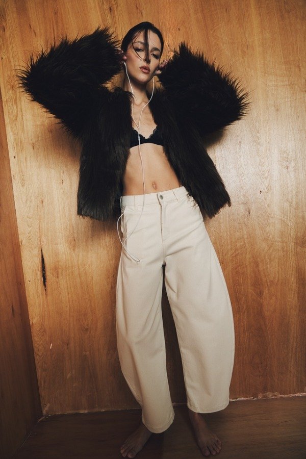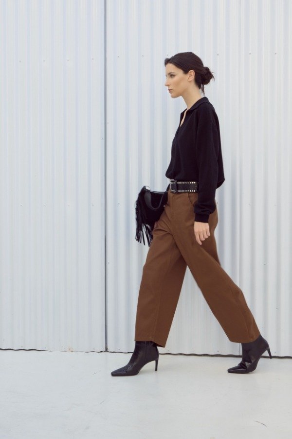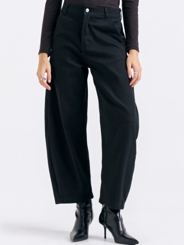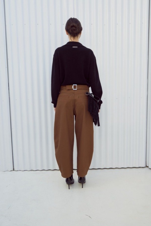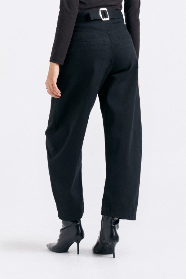 Pantalón tiro alto de gabardina. Calce con pierna curva y detalle de hebilla en espalda.