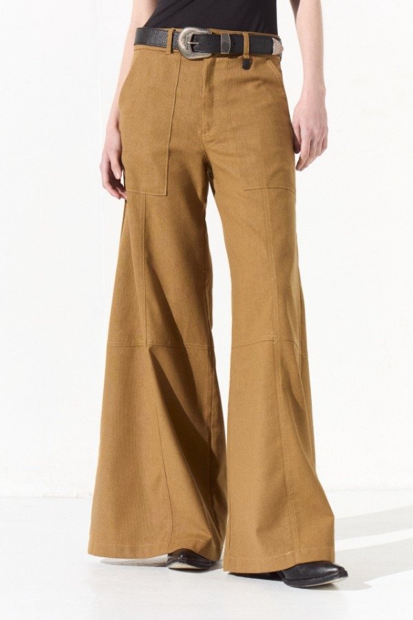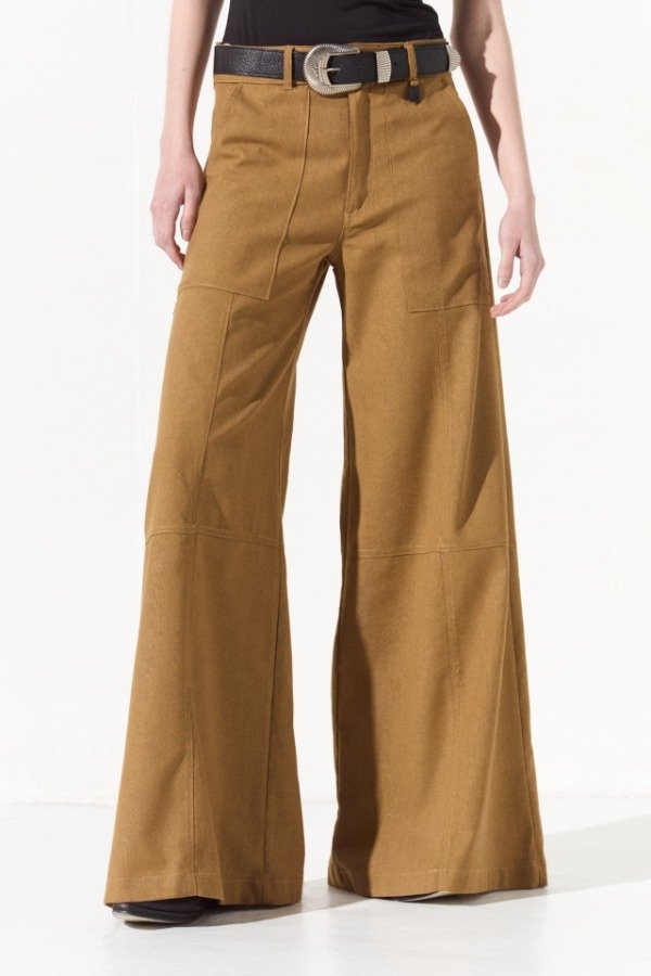 Pantalón de lino con cintura ancha, con recortes y bolsillos superpuestos. Botamanga ancha.