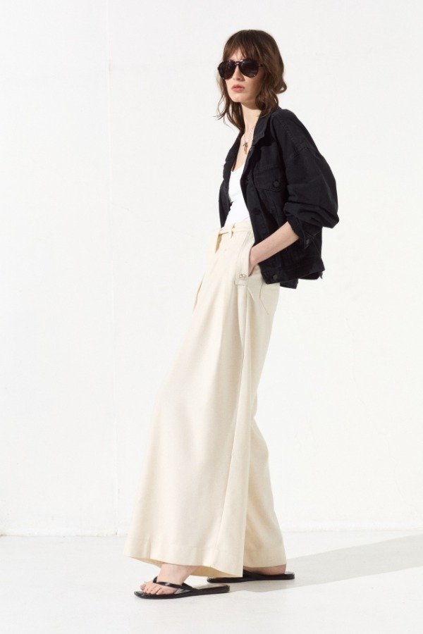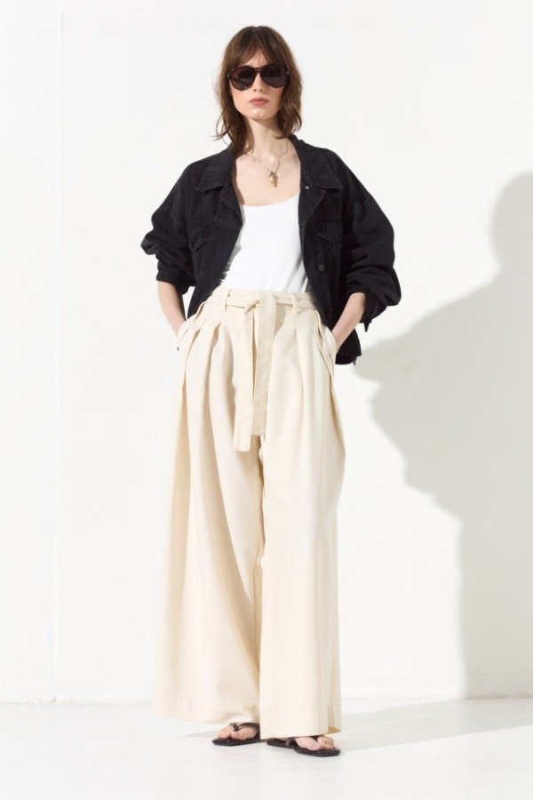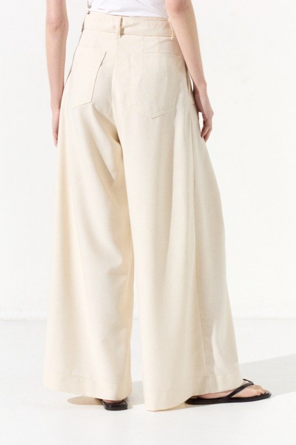 Pantalón sastrero pinzado con lazo en cintura, posee bolsillos con tapa en el delantero, uno de ellos atracado con un dije que lleva la identificación de marca, en el trasero cuenta con dos bolsillos superpuestos terminados con doble pespunte. En los laterales internos lleva una cinta bebe que permite colgar la prenda.