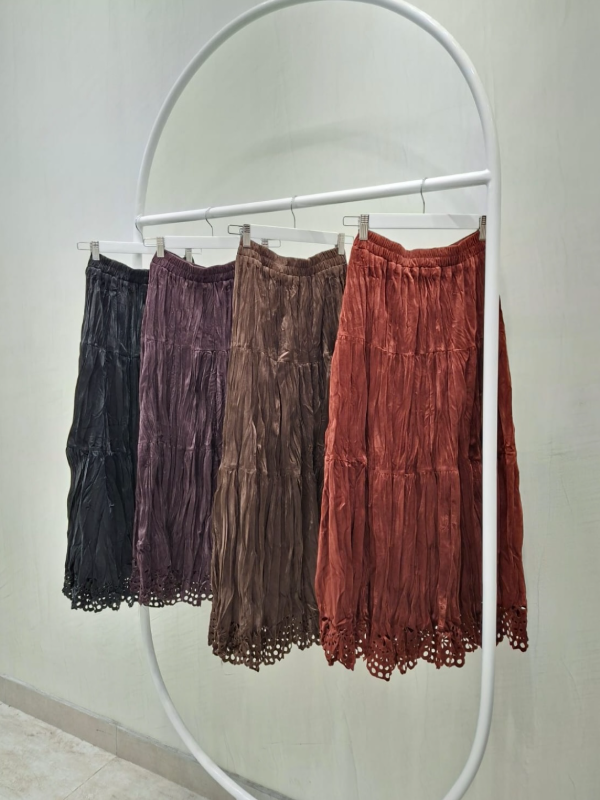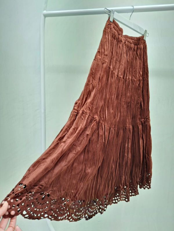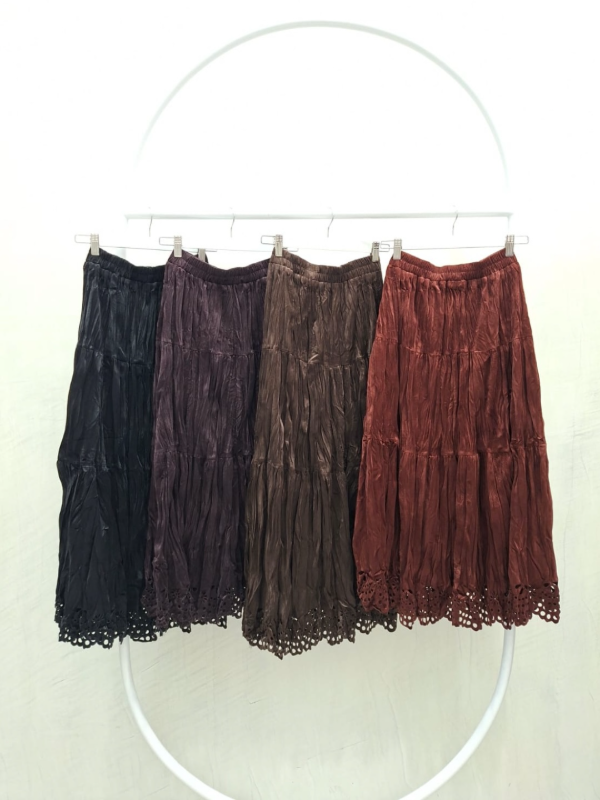 Falda larga de terciopelo con textura arrugada y detalle de borde calado