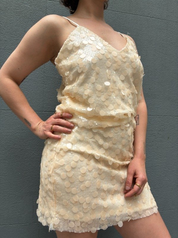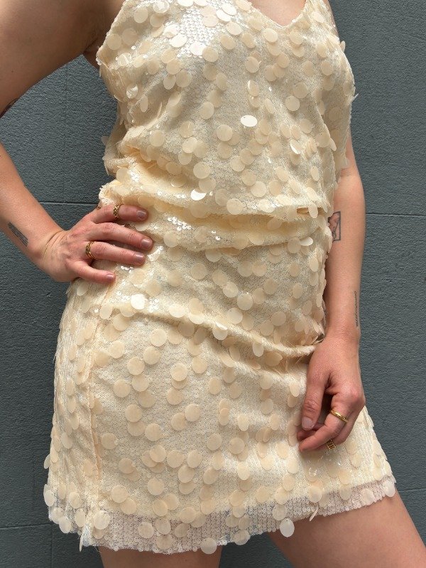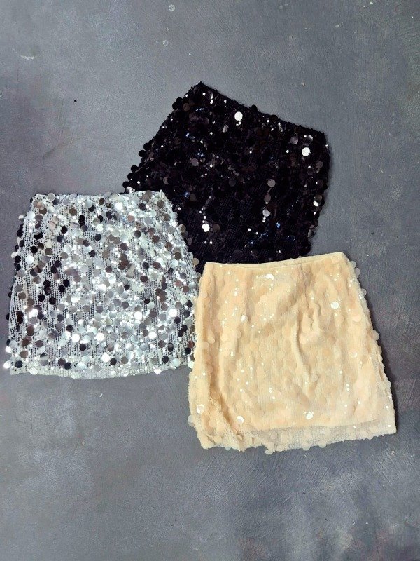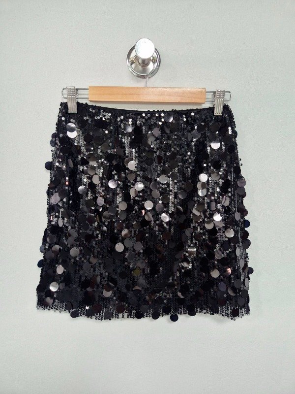 Pollera confeccionada en tela elastizada con lentejuelas, con cierre lateral y forrería interna.