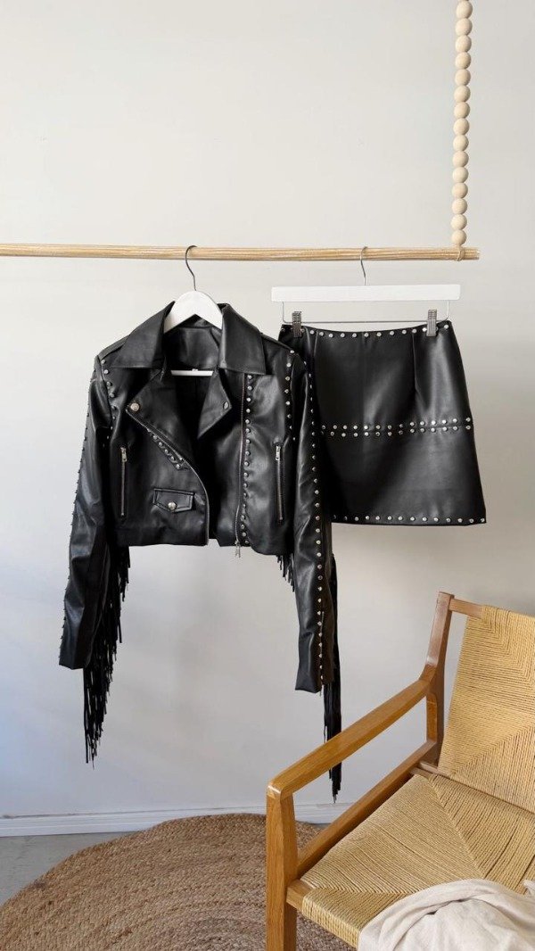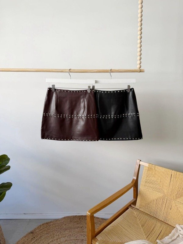 Mini de ecocuero tiro alto con pinzas en delantero. Detalle de tachas. Producto importado.