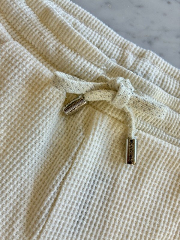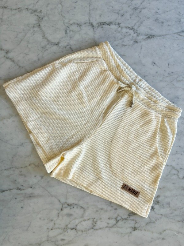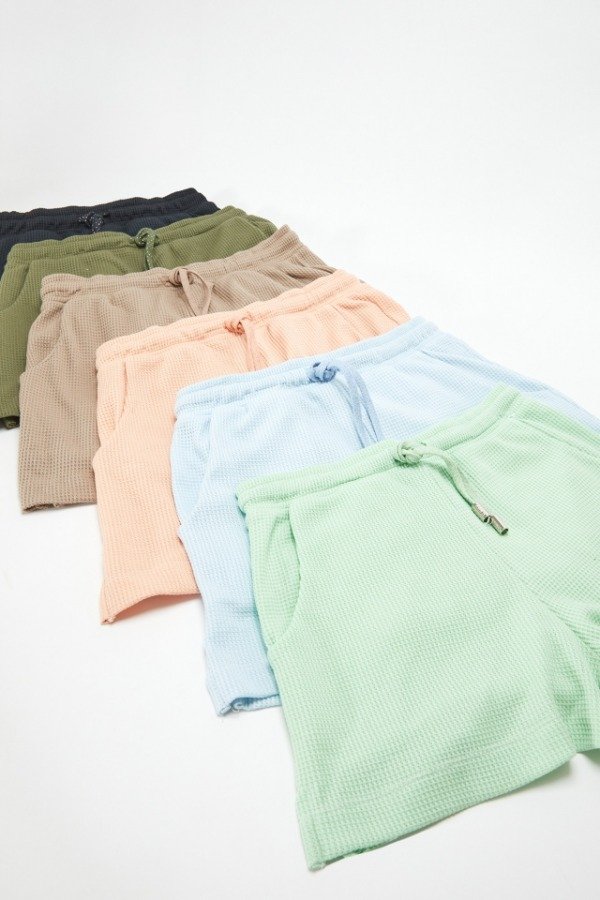 Short de textura waffle, su corte es clásico, lleva elástico en cintura y cordondes con terminal metálico e identificación de marca.
