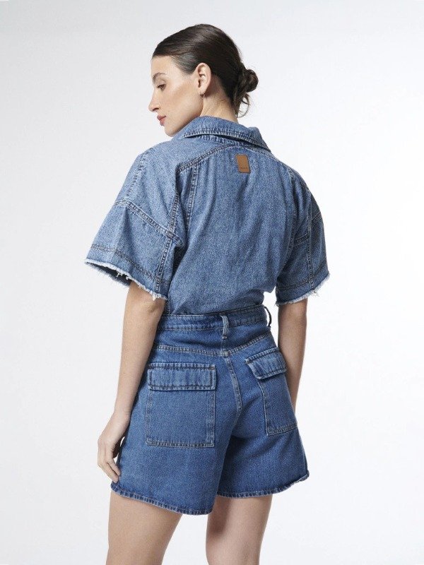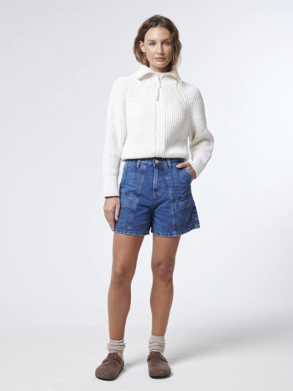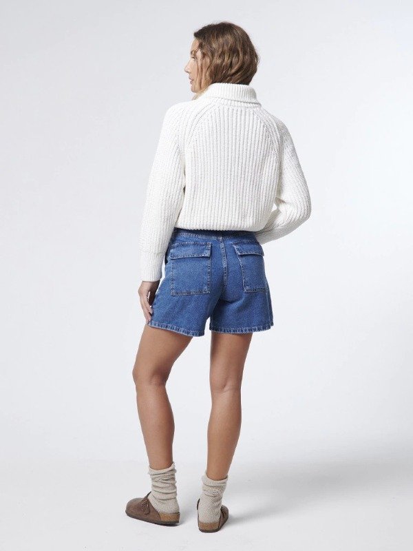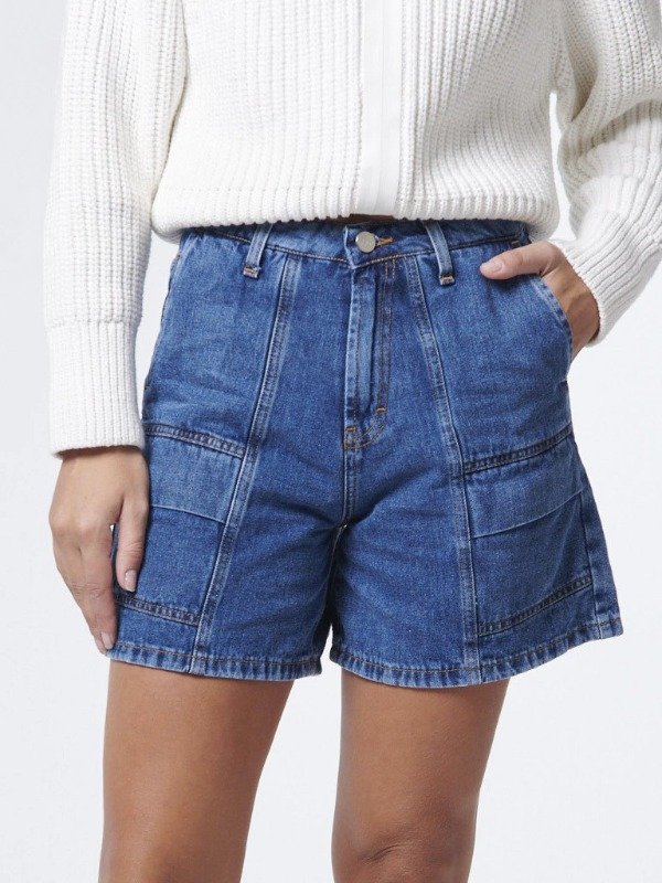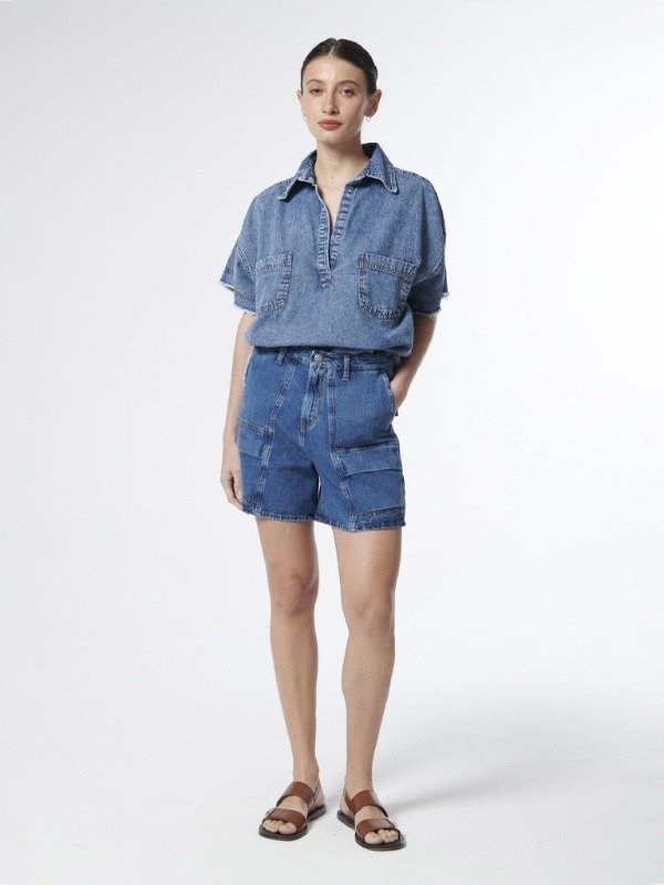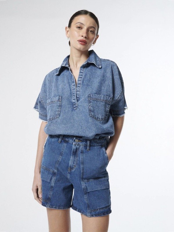 Short estilo cargo, con recortes y bolsillos en delantero. Es de tiro medio y esta confeccionado en denim 100% algodón y tiene un lavado azulado con reservas en costuras. Si sos de usar prendas más relajadas te recomendamos elegir un talle más para lograr un tiro más bajo. Es ideal para lookear en invierno con sweater y botas!
