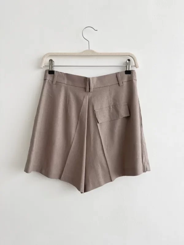 Descripción : Short sastrero con tabla pinzada en delantera y pinzas de entalle en el trasero. Bolsillos ocultos delanteros y falsos en el trasero. Cerrado frontal con cierre y botón.