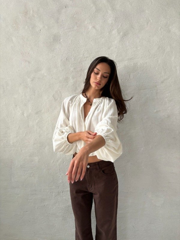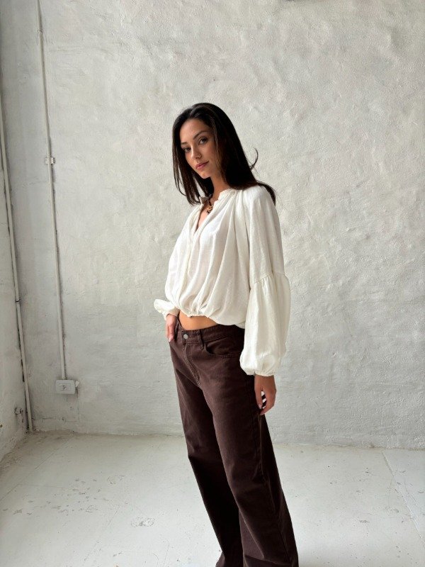 Blusa manga larga globo de tela lino italiano, escote v, elastico en parte inferior y puños.