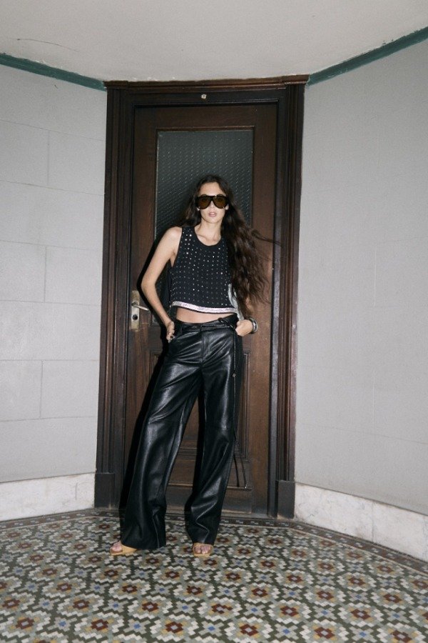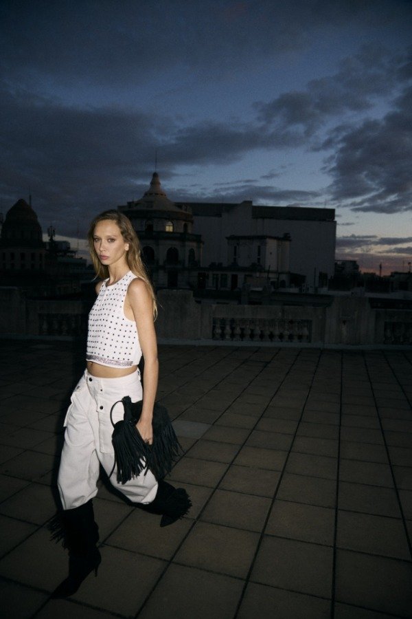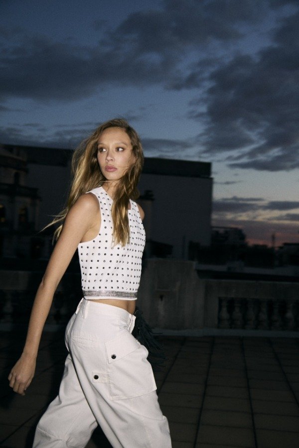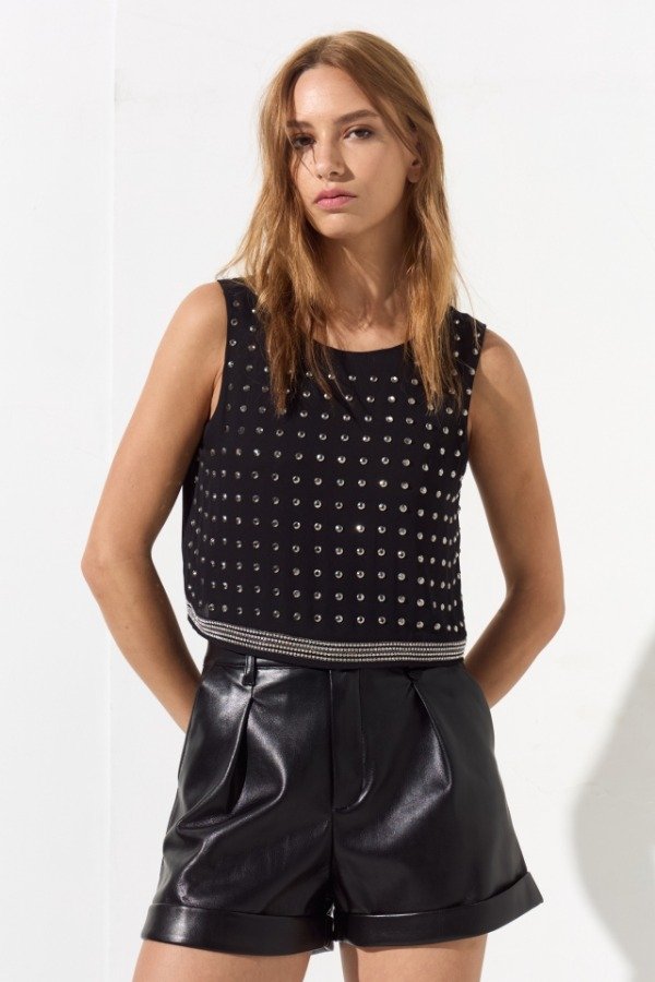 Blusa confeccionada en gasa con intervención de tachas y detalle de galón en zona ruedo.
