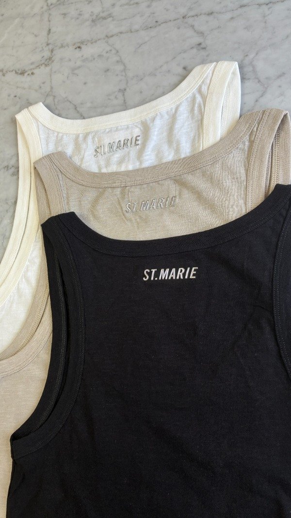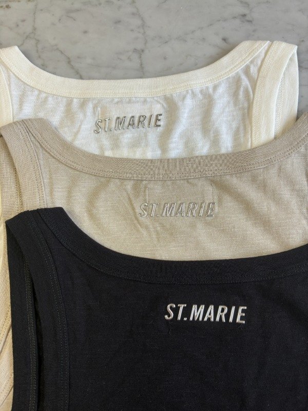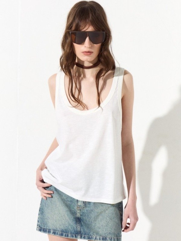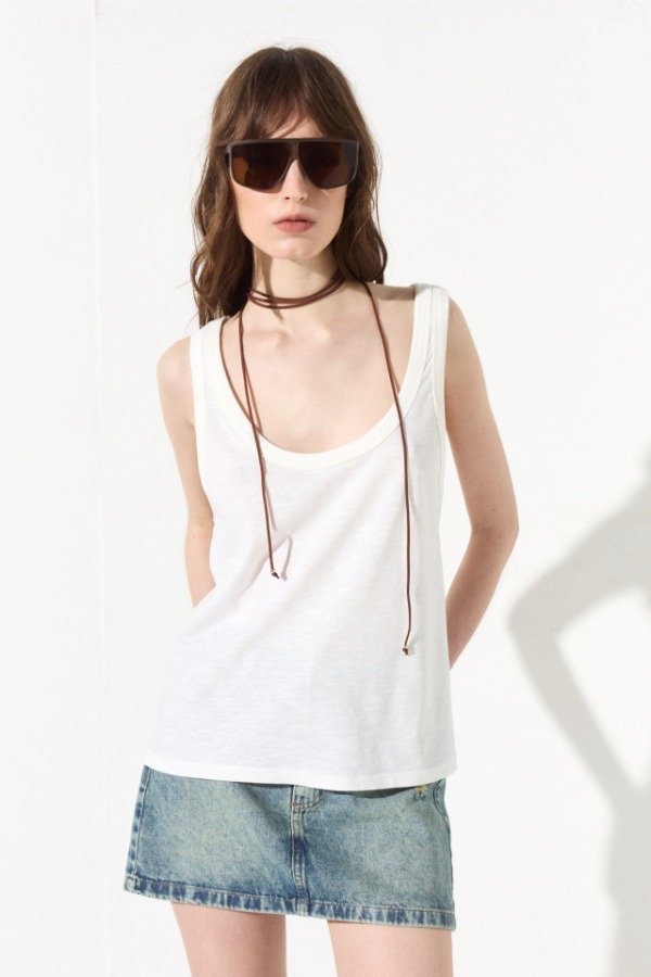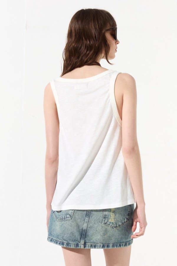 Musculosa de flame tiene escote redondo combinado con una collareta de reeb ancha, también está complementado en sisas. Tiene un largo hasta la cintura y tiene una caja amplia. En su espalda superior lleva un logo metálico con la identificación de la marca.