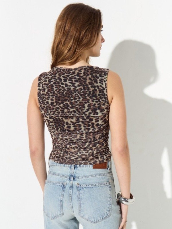 Musculosa de tul con estampado full animal print; la misma posee un escote redondo clásico, sus laterales están fruncidos y su delantero y espalda llevan forrería.