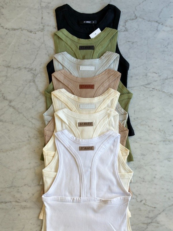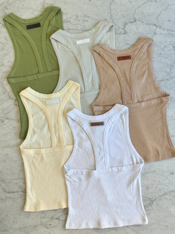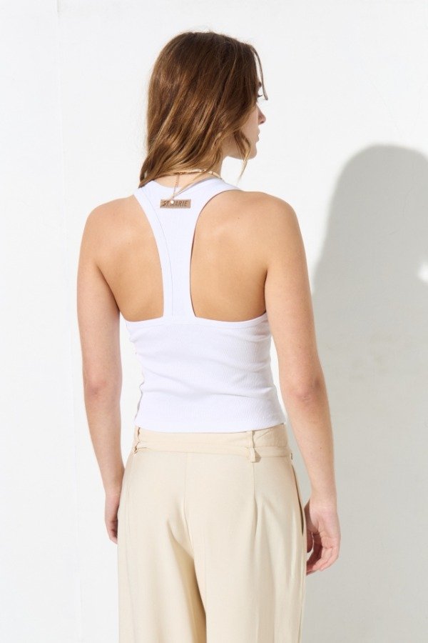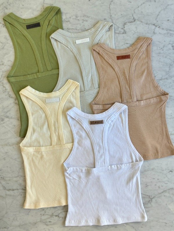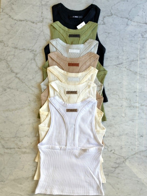 Musculosa de morley, escote clásico redondo, con collareta de jersey a tono. Detalle de badana con marca grabada a contratono, en el centro de la espalda.