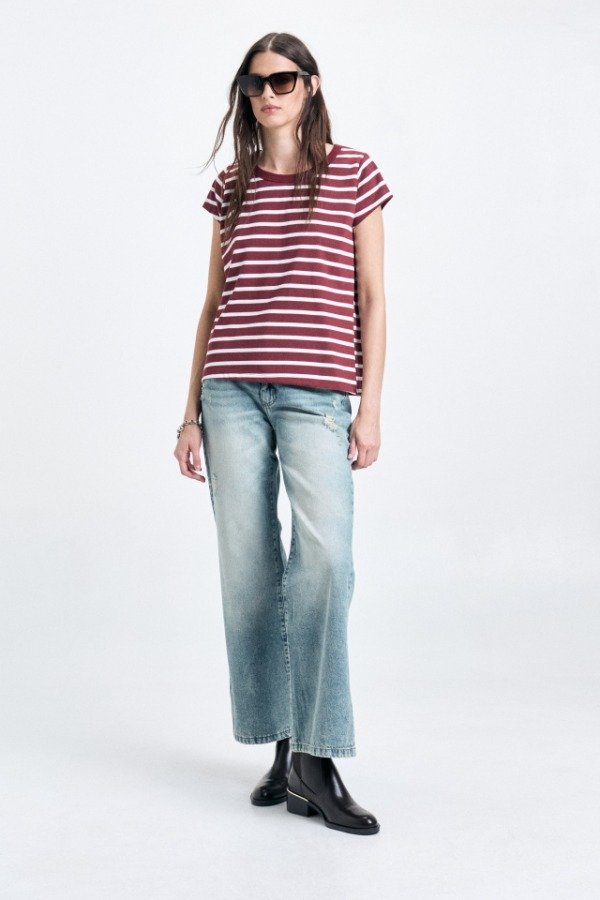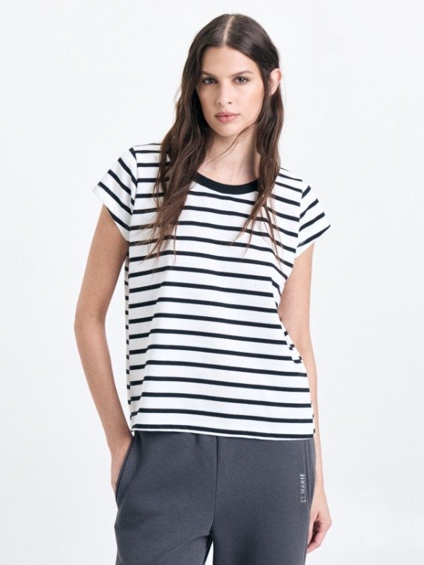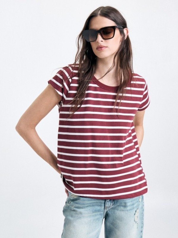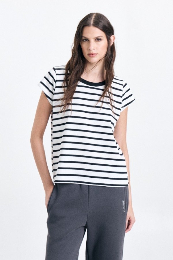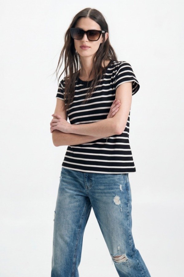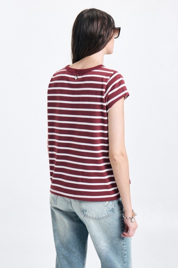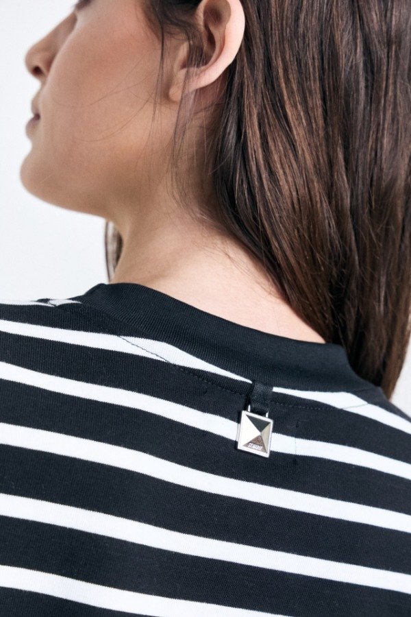 Remera de jersey rayado, cuello redondo clásico combinado con complemento. Detalle de chapita colgante en espalda.