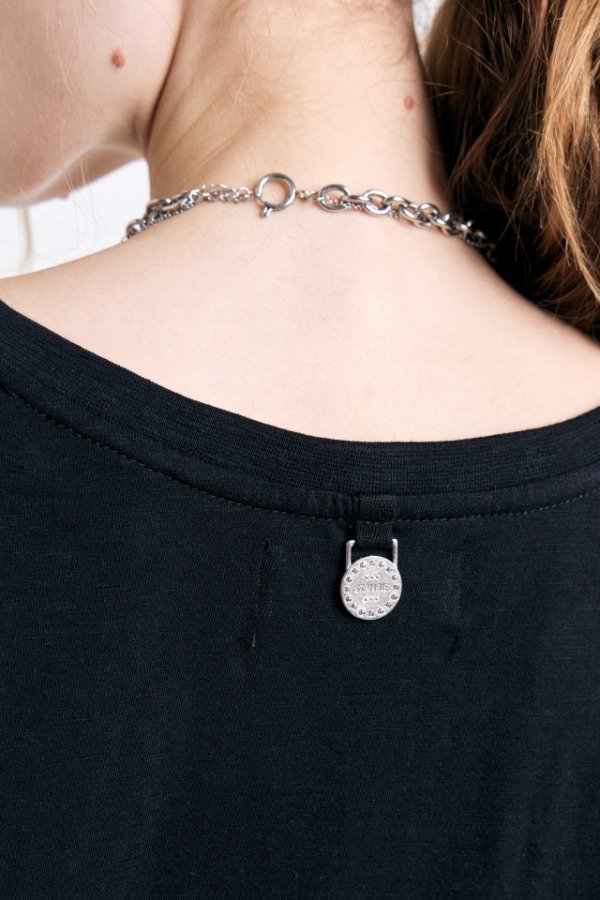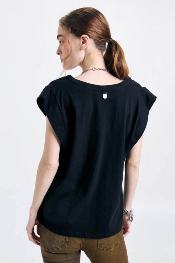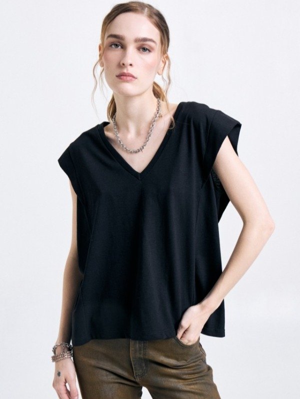 Remera flamé escote V con hombros proyectados, calce clásico. Avíos personalizados.