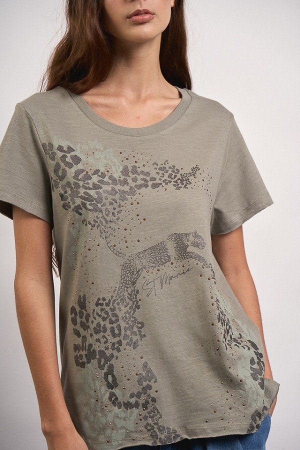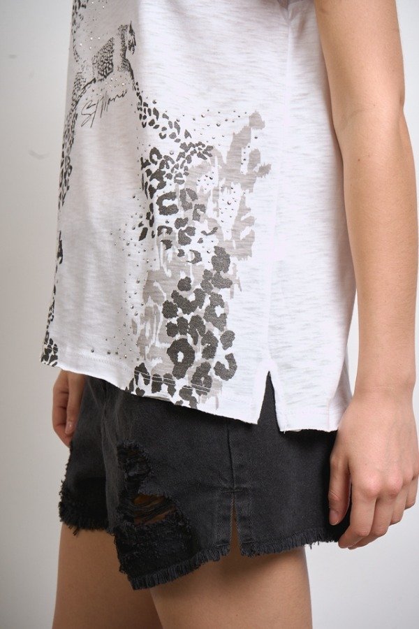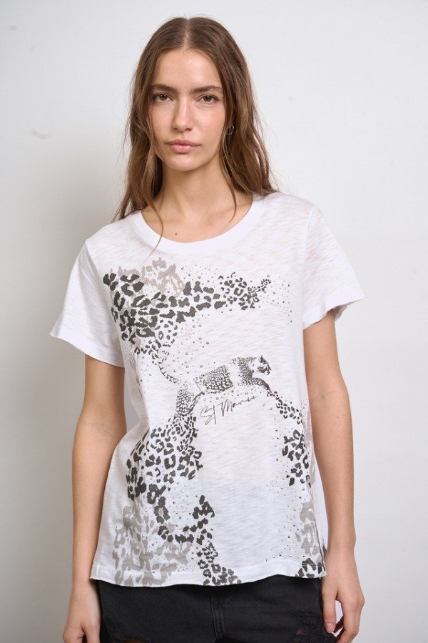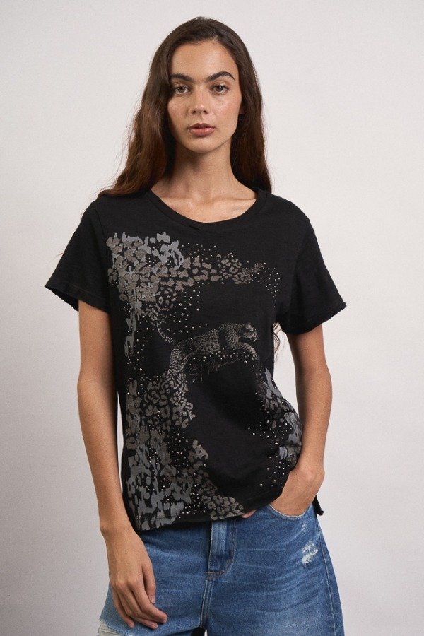 Remera de flame, escote y manga clásica, con estampa personalizada y detalle de hotfix.