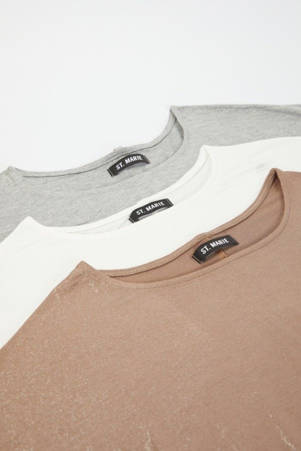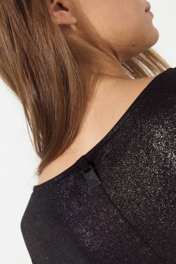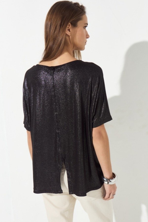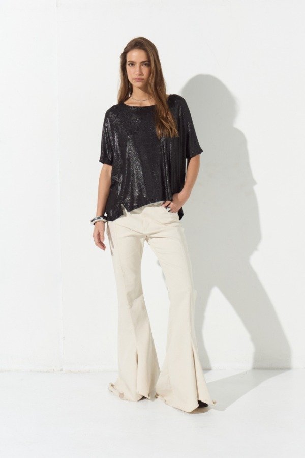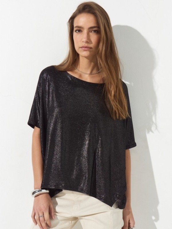 Remeron de viscosa, su tela es de foil brillosa. Su delantero es mas corto que su espalda y en su centro tiene un tajo. Sus laterales también cuentan con pequeños tajos, que terminan de darle terminación a la prenda. Además a modo de detalle posee un colgante con la inscripción de la marca que acompaña a tono.