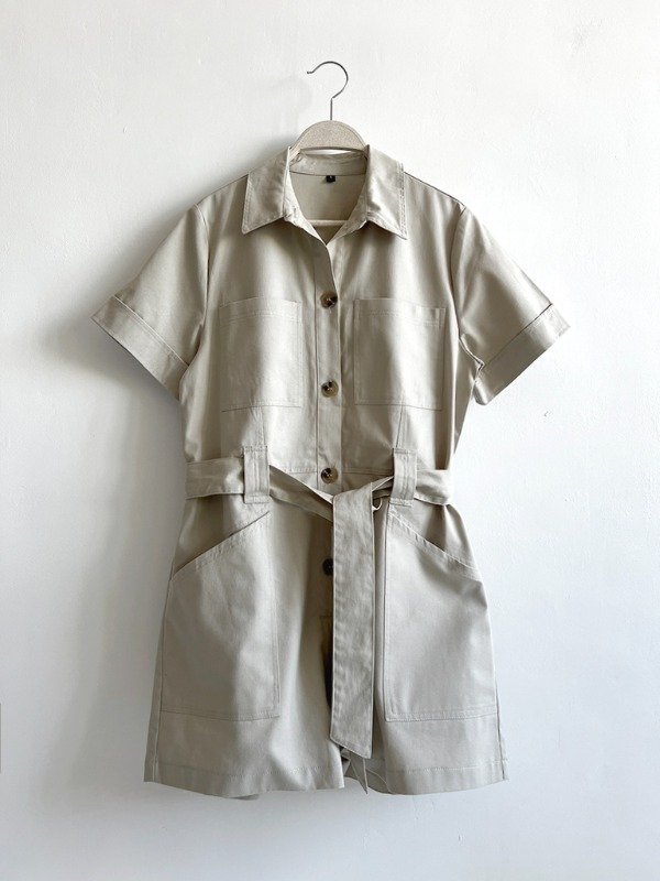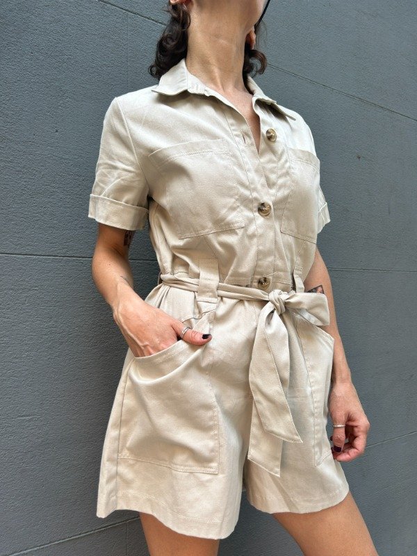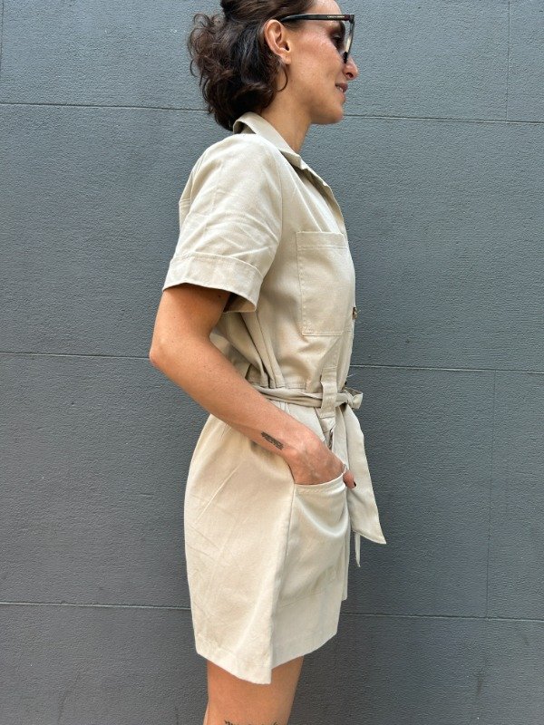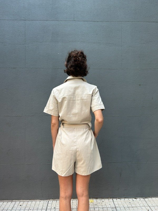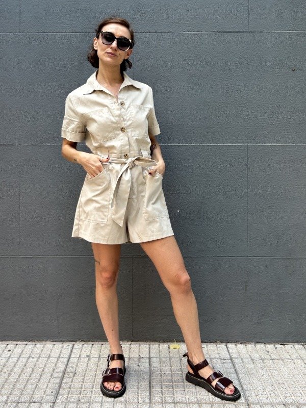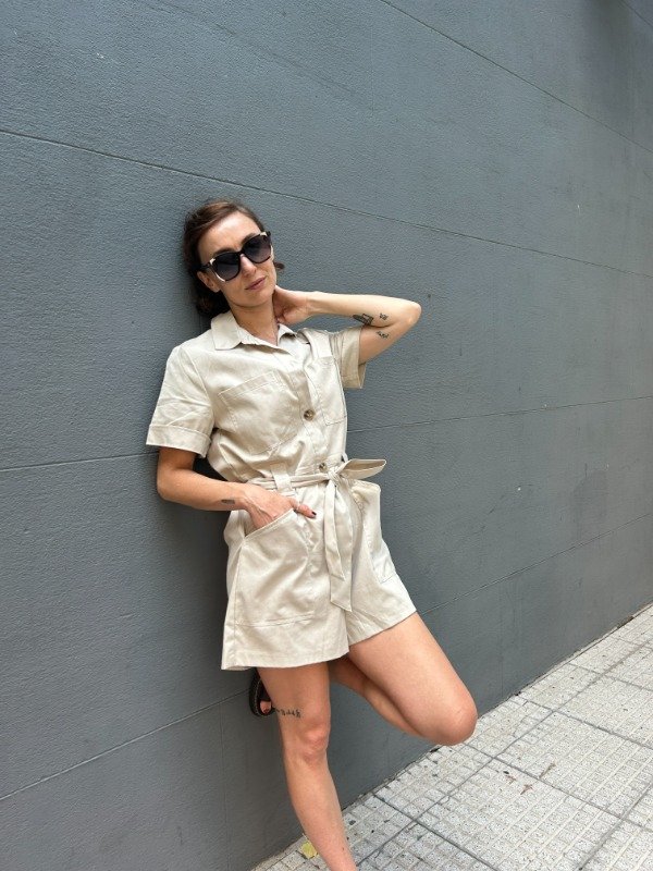 Descipción : Mono corto de cuello solapa y manga corta con botones. Bolsillos delanteros y detalle de cinto.