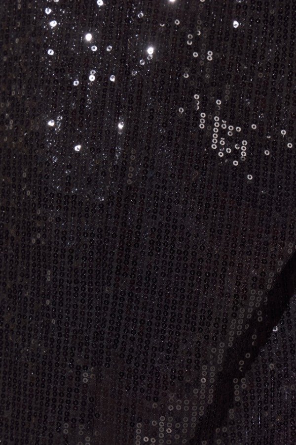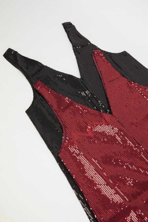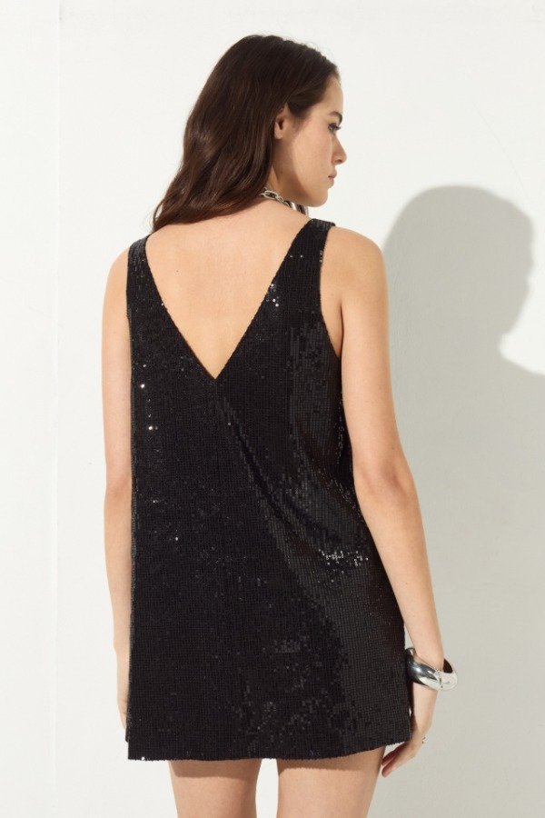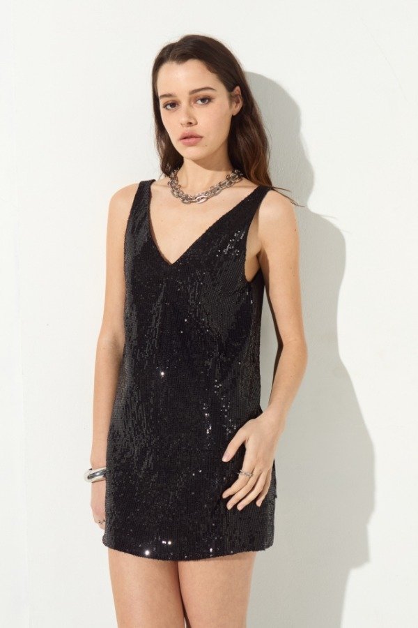 Vestido corto de lentejuelas. Tiene escote V y anchos breteles.