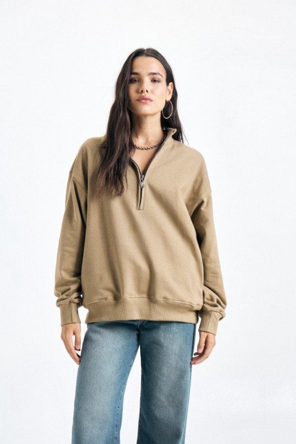 Buzo de rústico, en su delantero posee dos bolsillos invisibles y su escote cuenta con un cierre de plástico a tono con tira cierre para abrir o dejar cerrado a gusto, todo el exterior está pespunteado con hilo a tono y en el centro de su espalda, lleva un reflex con la marca grabada. También está combinando en puños y ruedo con un jersey a tono.