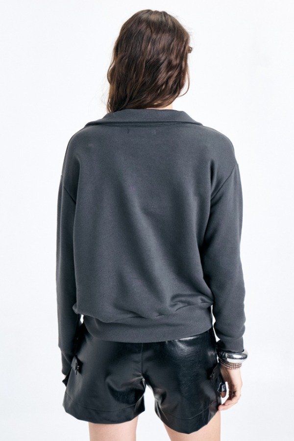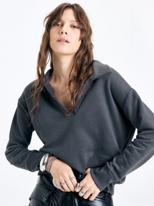 Buzo de rústico con escote v estilo polo. En delantero inferior izquierdo lleva badana de marca.