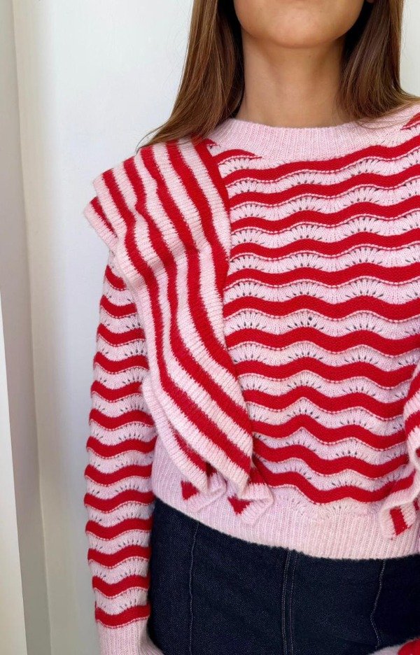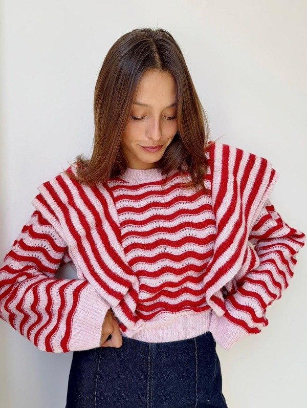 Descripción: Sweater de cuello redondo. Mangas largas. Detalle de calado y acabados con volantes.