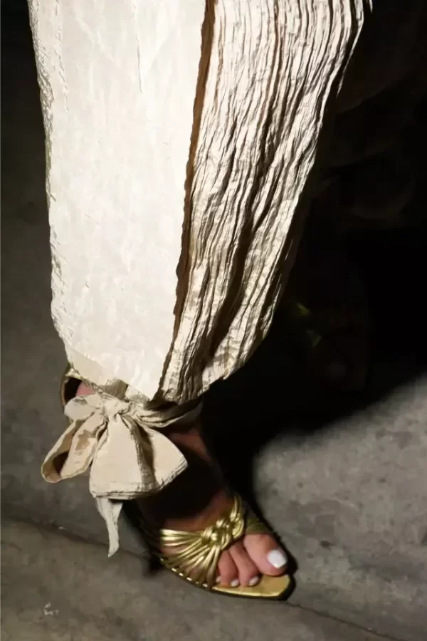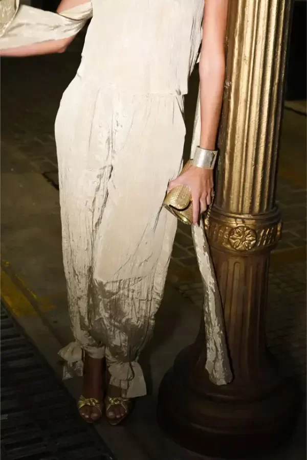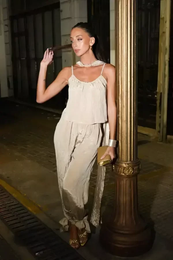 Babucha tiro medio con pierna amplia, frunces suaves y lazo ajustable en los tobillos.