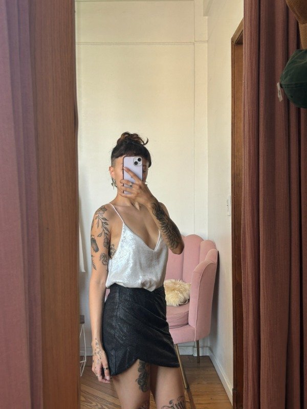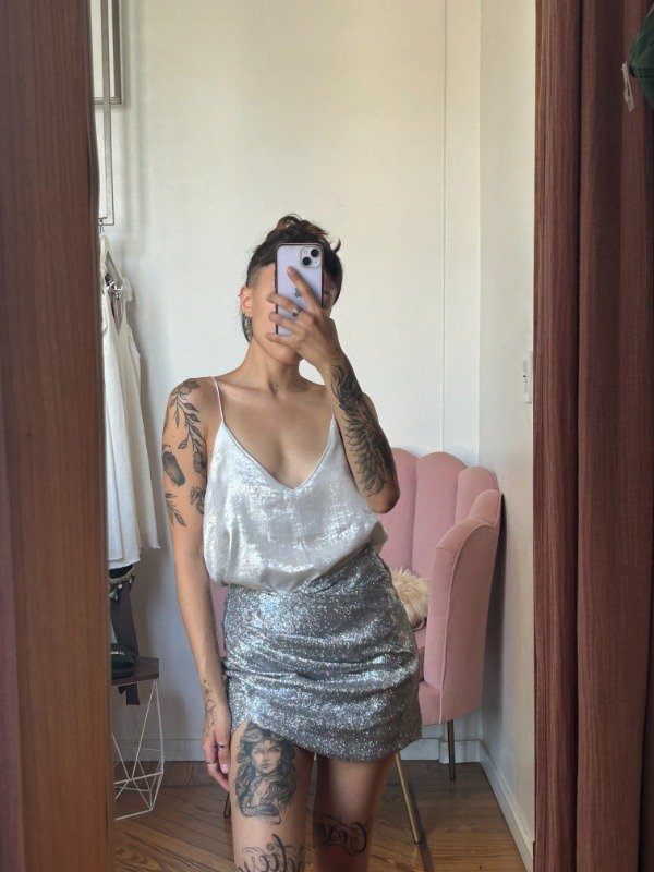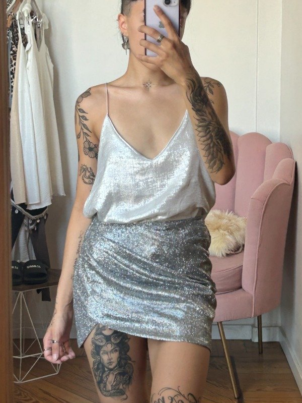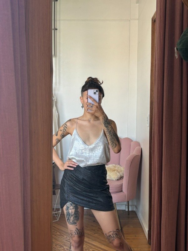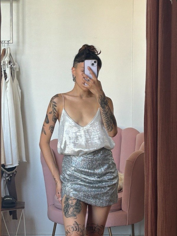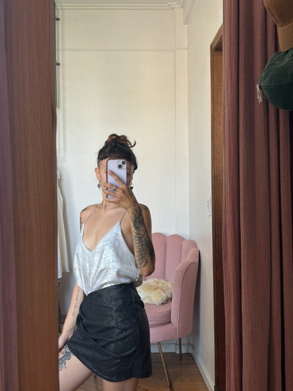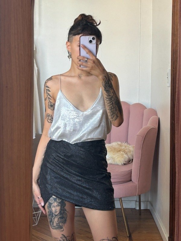 Mini de lurex con frunce. Cierre detrás. Tiene forreria y es rigida