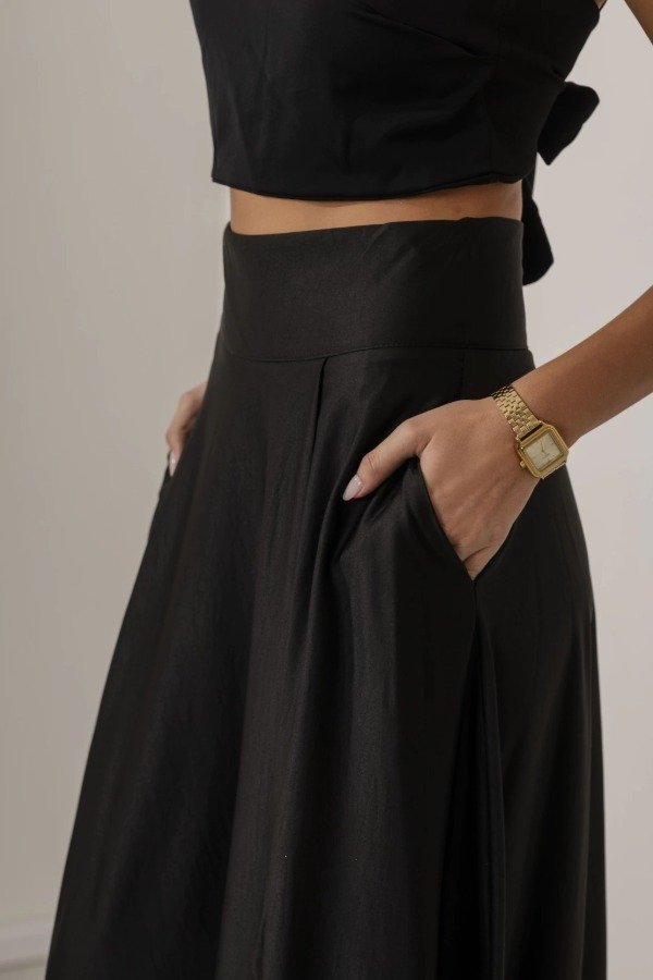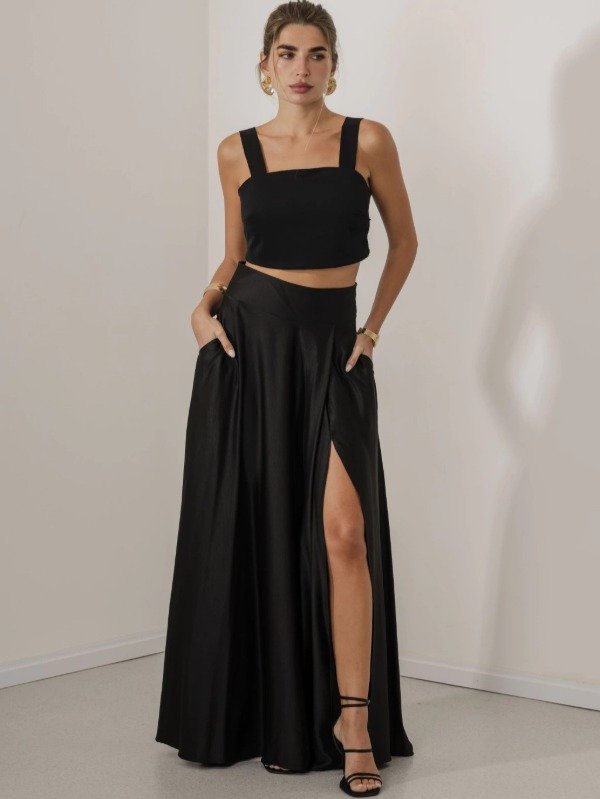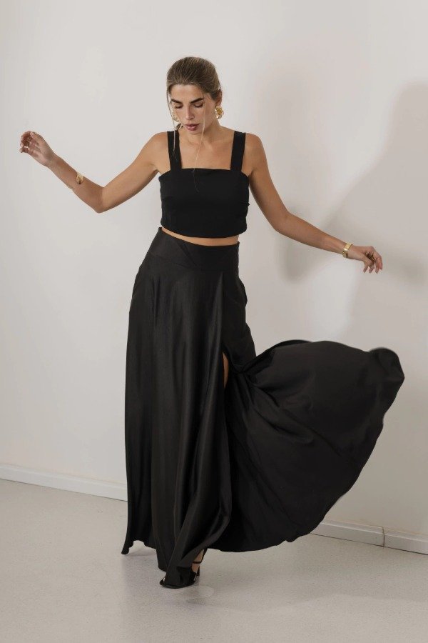 Descubre la maxi falda de crepe sedoso liso que redefine la elegancia y la comodidad. Confeccionada con un material liviano, esta prenda ofrece una caída perfecta que se mueve con cada paso. Destaca por su tajo lateral que añaden un toque sensual y permiten una movilidad excepcional.