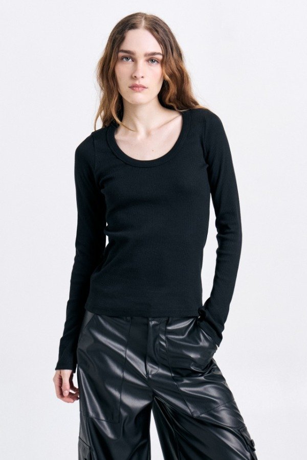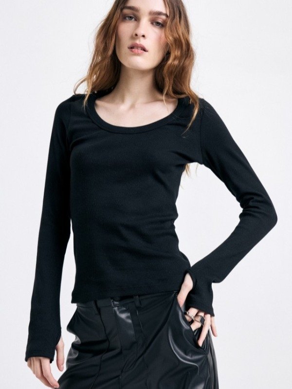 Remera de morley con ly, escote en U, manga larga con detalle dedo pasador y etiqueta personalizada en espalda.